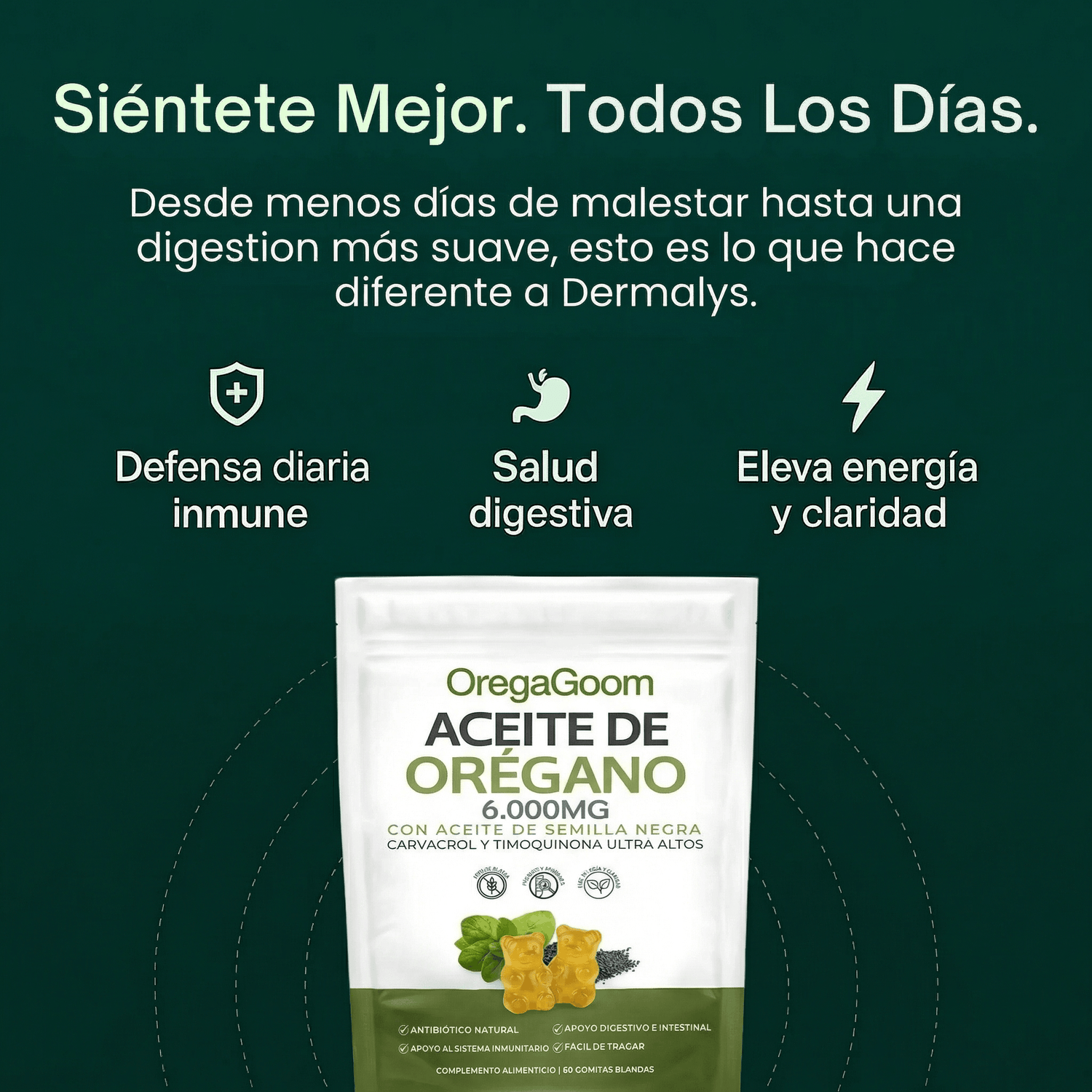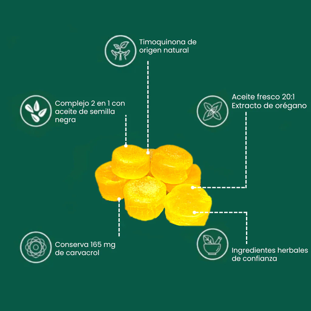 Este producto combina aceite de orégano de alta potencia (6.000 mg) con aceite de semilla negra, dos ingredientes con propiedades antimicrobianas, antiinflamatorias y potenciales beneficios digestivos.Está pensado para apoyar el sistema inmunológico, mejorar la salud intestinal, aliviar inflamación, reducir hinchazón, y promover un bienestar general. También puede aportar un impulso en energía y claridad mental, al mejorar el equilibrio digestivo e inmunológico.
